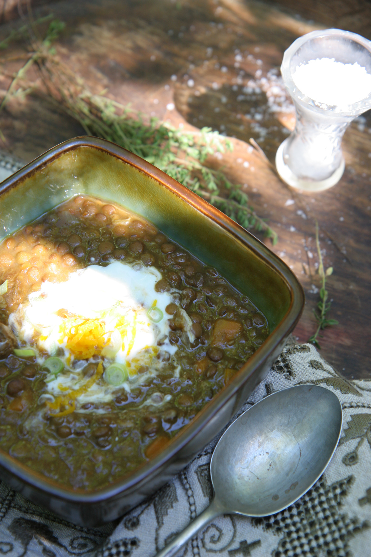 My kosheld Nigel Slater pak op Oujaar spens reg en maak dan lensiesop met byt op Nuwejaarsdag. Ek wag vir ‘n koue dag net voor die lente aanbreek vir die groot spensskrop en maak dan ‘n hitsige harissa lensiesop wat, soos Nigel se sop, terselfdertyd sweepslag én soen is.