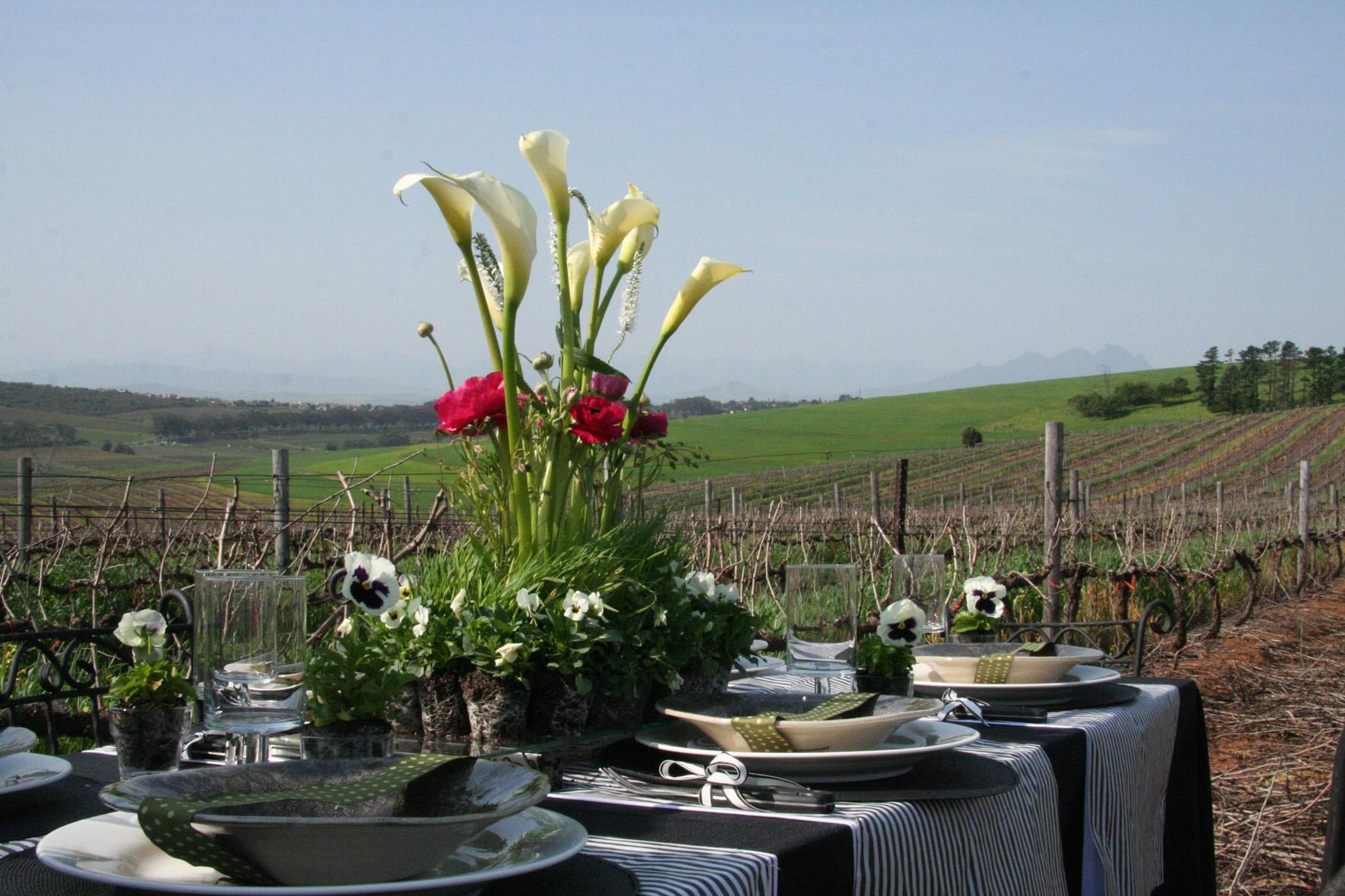- ‘n Swart tafeldoek sorg vir verrassing en kontras en skep tong-in-die-kies weelde tussen die wingerde.