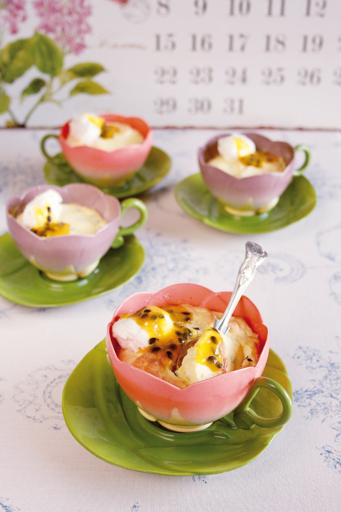 Spray 6 large or 12 small soufflé ramekins with a non-stick food spray and sprinkle with brown sugar. Cut the granadillas in half and scoop out the pulp in a small saucepan and cook until reduced. Mix pulp with the crème patisserie. Beat the egg whites until they form soft peaks, then add sugar and beat until they form stiff peaks. Fold in half of the egg whites and the salt into the crème patisserie, then fold in the other half of the egg whites. Spoon into soufflé ramekins and bake in a bain marie at 180⁰ C for about 15 minutes.