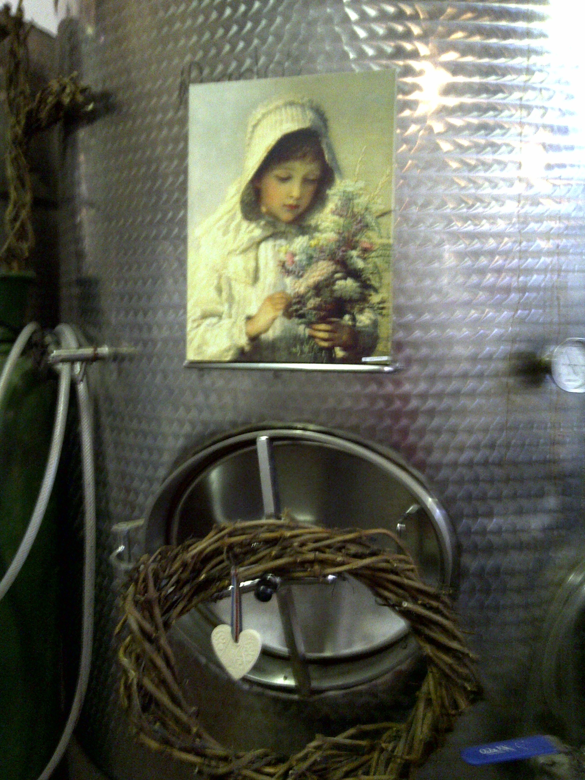 Prints of 17th century paintings of pastoral landscapes and others of angels and pink-cheeked cherubs are haphazardly placed on the tanks’ industrial-looking hatches, while brightly coloured handbags and festooned wreaths woven from dry vine cuttings add their cheeky touch.