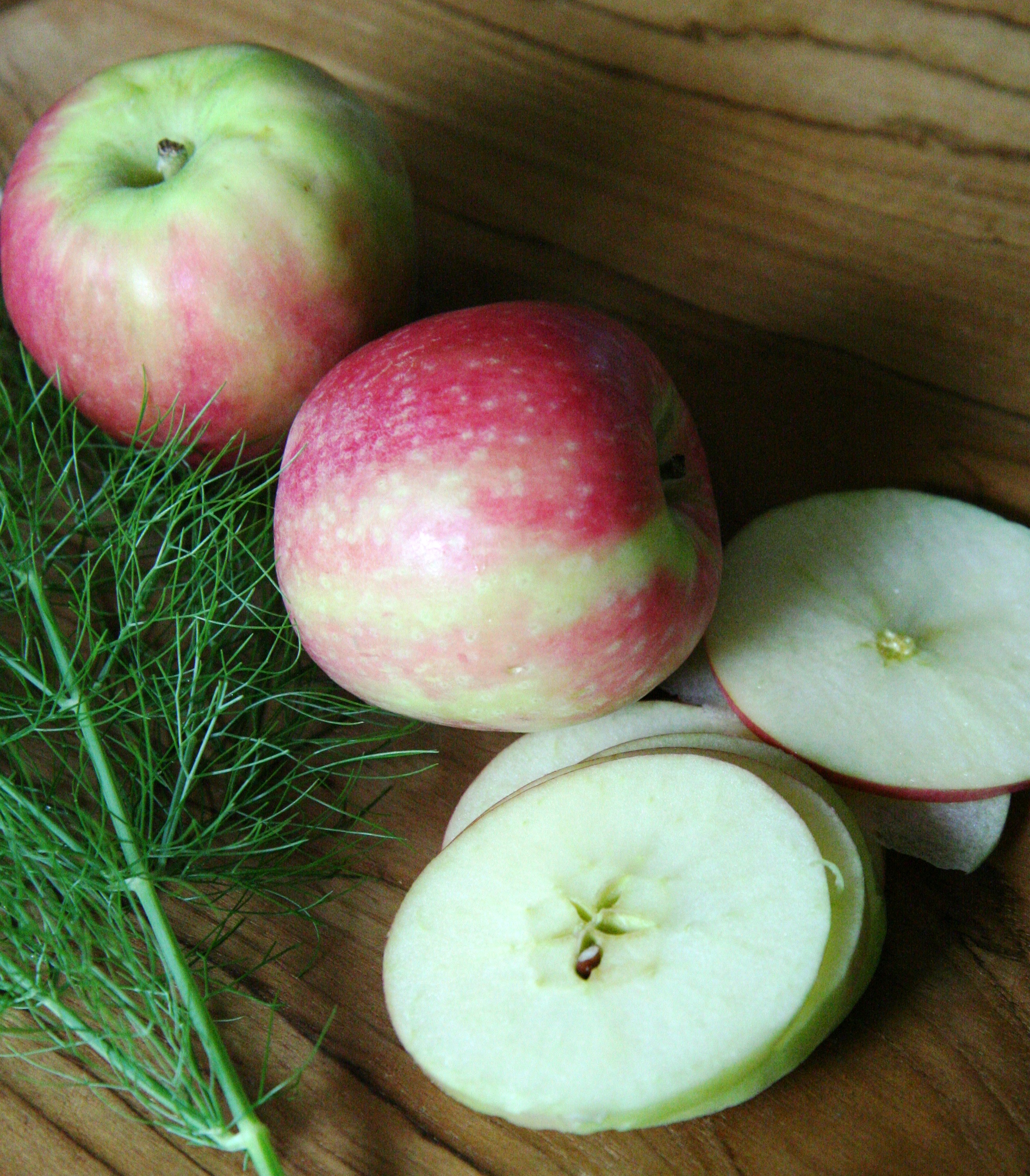 In plaas van die eintlik-te-soet koshuis-appelsous maak ek ‘n kraakvars slaai van appel en vinkel, met ‘n loperige mayonnaise-slaaisous. (Vriendin Anita sit die varktjops voor met roerbraai-rooikool, ‘n goeie idee wat ek nog sal probeer. )