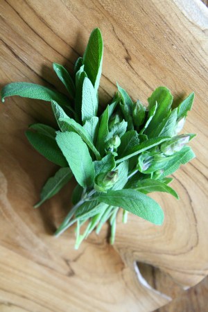 As daar vars salie in die groentetuin is braai ek dit bros om bo-op die tjops te bedien.