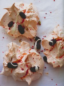 Ek is mal oor enigiets met meringue – van suurlemoen meringue tert tot daai heerlike deurmekaar nagereg Eton Mess wat van gebreekte meringues, aarbeie en room gemaak word.  Toe ek op my rak soek na Lannice se boek Posh Nosh vir haar amandel pavlovas, val my oog op Purple Citrus & Sweet Perfume deur Silvena Rowe. Haar resep vir meringues met ‘n Turkse streep is hemels. Ek weet Lannice met haar suikertand en sin vir die eksotiese sou dit verslind: pienk peperkorrel en kardomom meringues met moerbeie en wit sjokolade.