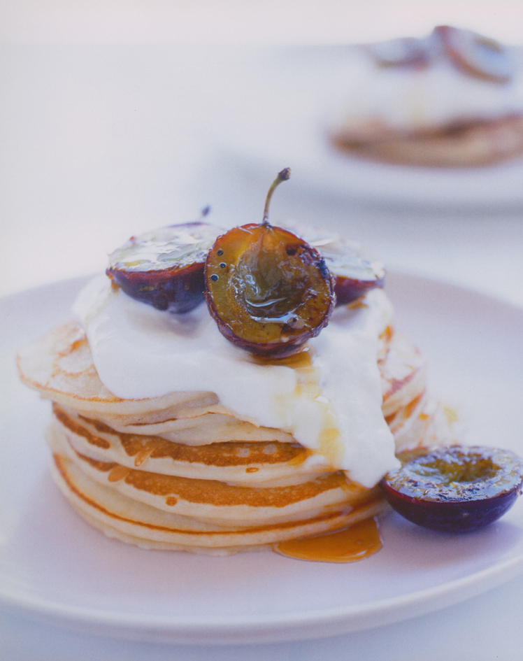 Jy kan dit voorsit met gekarameliseerde pruime – ewe maklik: maak ‘n braaipan baie warm, sny jou pruime in die helfte en besprinkel die gesnyde kante met suiker. Plaas die pruime suikerkant in die warm pan en laat die suiker smelt en karameliseer vir omtrent 1 minuut. Bedien die pankoekies in stapeltjies met die pruime, esdoringstroop en jogurt.