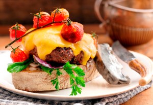 Ek noem hierdie oopgesig hamburger met kaas, taktamaties en romerige sampioene op ciabatta van sommer ‘n Kaasburger Cabriolet. (As jy ‘n ‘skinny’ weergawe soek, braai net die sampioene bruin in bietjie olyfolie en los die room – maar die kaas is nie onderhandelbaar nie – goeie, verouderde cheddar of gouda met karakter en pedigree).