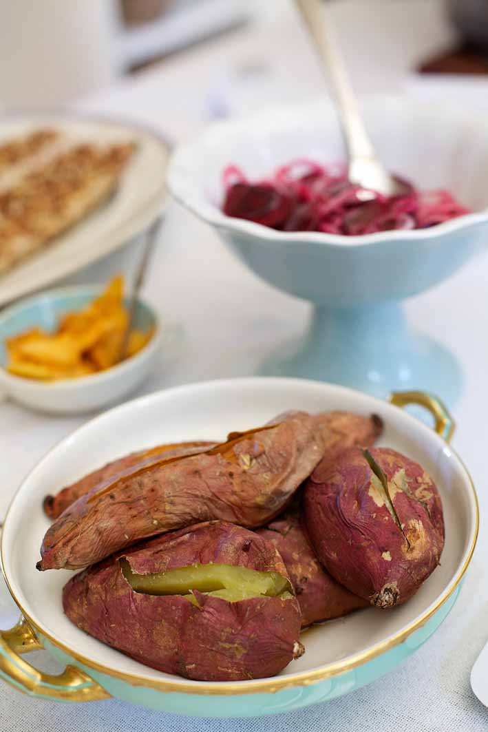Patats: was die patats goed af, prik die skil met ‘n vurk en bak in ‘n voorafverhiite warm oond 200 °C tot die patat sag is en die skil begin loskom. Medium grootte patats bak sowat 60 minute.