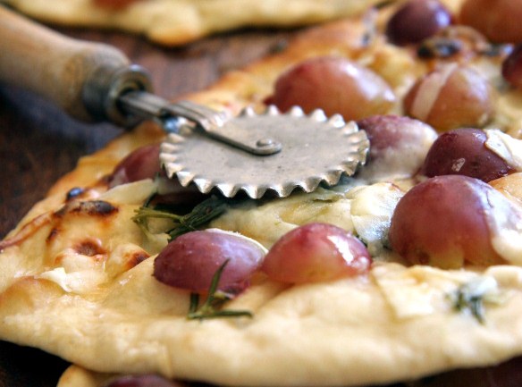 Sny die gekoopte deeg in 4 stukke. Rol die deeg baie dun uit en bak in die warm oond tot die deeg plek-plek sulke blase maak en goudbruin is. Nou’t jy ’n baie lekker bros kors. Smeer nou die basis met die fyngestampte roosmaryn en die kruierige olietjies wat in die stamper oorbly. Strooi die druiwekorrels oor, bedek met die parmasaanskaafsels en bedruip met die heuning. Sit dit dan net vinnig weer in die oond sodat die Parmasaan net-net begin smelt.