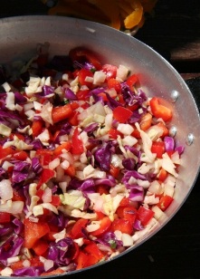 Soteer die groente in die olie in ‘n pan oor warm kole tot sag en die uie deurskynend is.