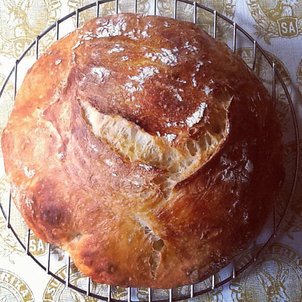 Die resep wat in New York Times verskyn het, het Bakker Jim Lahey van die Sullivan Street Bakery oornag beroemd gemaak het. Hy het dit later in sy boek ‘My bread – the revolutionary no-work, no-knead method’ ingesluit. Dis maklik, en jy’t niks meer nodig as as ‘n platboom swartpot en sowat 18 ure vir rystyd nie. En selfs as jy nie ‘n ysterpot het nie, sal ‘n Pyrex skottel met ‘n deksel ook deug.
