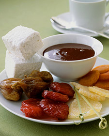 Die grootste lekkerte is sjokolade-fondue met marshmallows, stukkies gekristalliseerde gemmer, droë vye, pruime en appelkose om in die sjokoladesous te doop. Ander droëvrugte wat jy kan doop is droë pynappel, neute, of selfs broskoekies (shortbread)of madeleines. Baie smart. Baie Martha Stewart. Hierby bedien ek ‘n kelkie potketelbrandewyn uit Barrydale in die Klein Karoo…. ‘n geheim wat ons nie deel met liewe Martatjie nie.
