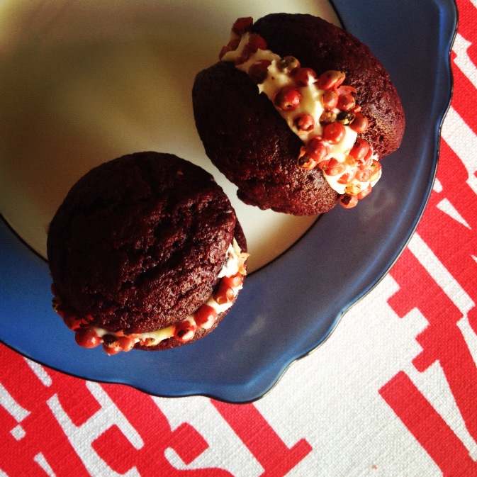 Herman se rooifluweel whoopie pie met my inner-spesery – pienk peperkorrels.     Roxy Laker neem fotos