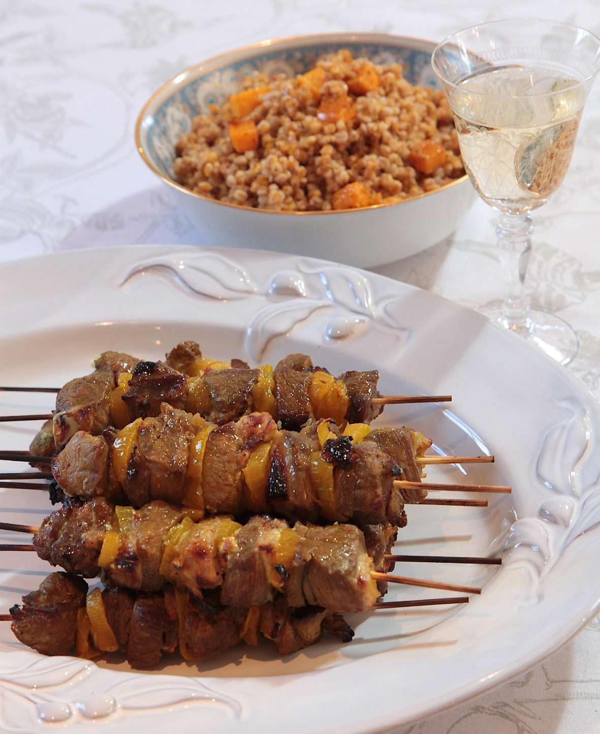 Karin de Villiers, wynmaker van Klein Roosboom ryg halfgaar blokkies botterskorsie en feta op roosmaryntakkies, besmeer met olyfolie en strooi growwe sout oor en braai oor die kole – goeie pêl vir sosaties.
