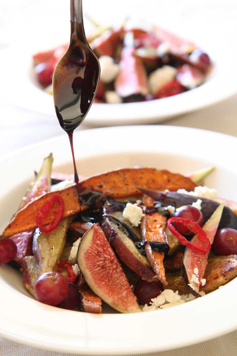 Plaas die soetpatat op ‘n plat slaaibord, gooi die warm sprietuie, rissie en olie oor die soetpatats. Rangskik die vye tussen die patatskywe en bedruip dit met die asynstroop.