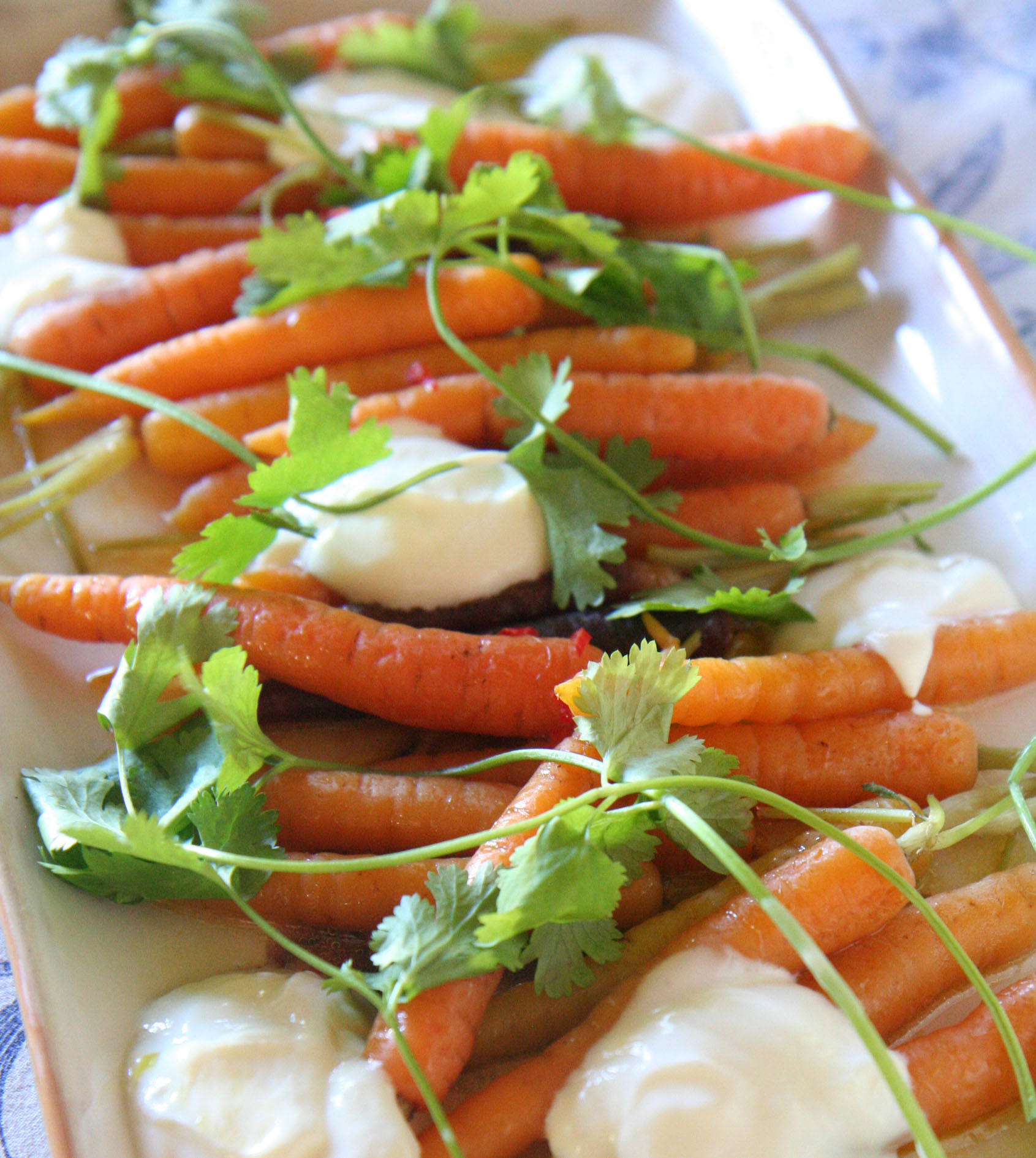 Jong wortels, koljander en jogurt met lemoensap-slaaisous
