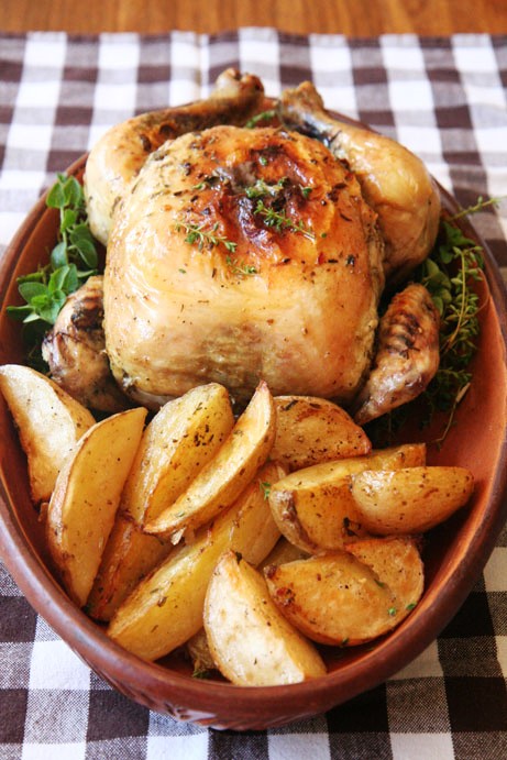 My langafstand hoendertjie met sy aartappel drafmaats. Ian het die foto geneem. Die ou bruin Lieberman bak het my ma in die sewentigs as geskenk gekry. Sy het dit min gebruik en was liewer vir Pyrex. Ek het weer gedink die bruin erdeware was die mooiste denkbaar.