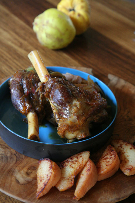 - Meng die volgende saam in ‘n bakkie: aftreksel, asyn, konfyt, paprika, koljander, komyn en knoffel; giet dit oor die skenkels. Pak die uie en lourierblare om die skenkels, sit die deksel op en bak in die oond vir 90 minute. Pak nou die kweperskywe rondom die skenkels, bedek weer en bak ‘n verdere 90 minute.