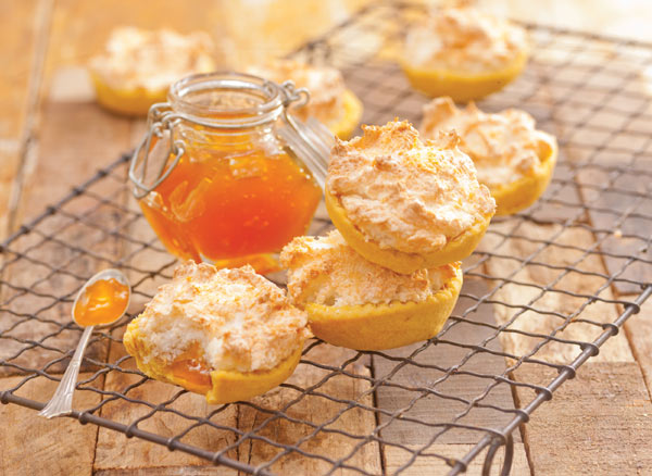 - Skep lepeltjies appelkooskonfyt in die deegdoppies en skep die eierwitmengsel bo-op.