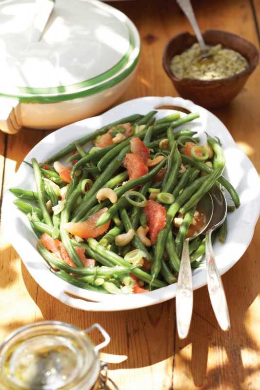 Die bittersoet pomelo verleen ‘n verfrissende smaak en skep ‘n mooi kleurkontras met die groenbone. Ek maak dit gereeld saam met feeskos, soos Kersdag of in die Paastyd – dis heerlik met lamsvleis. Die slaai is deel van ‘n artikel wat ek destyds vir Sarie Kos gedoen het oor ‘n familie-ete. Die smake is nuut en vars – eksoties selfs, maar gewaarborg om ‘n groot gunsteling aan tafel te word.