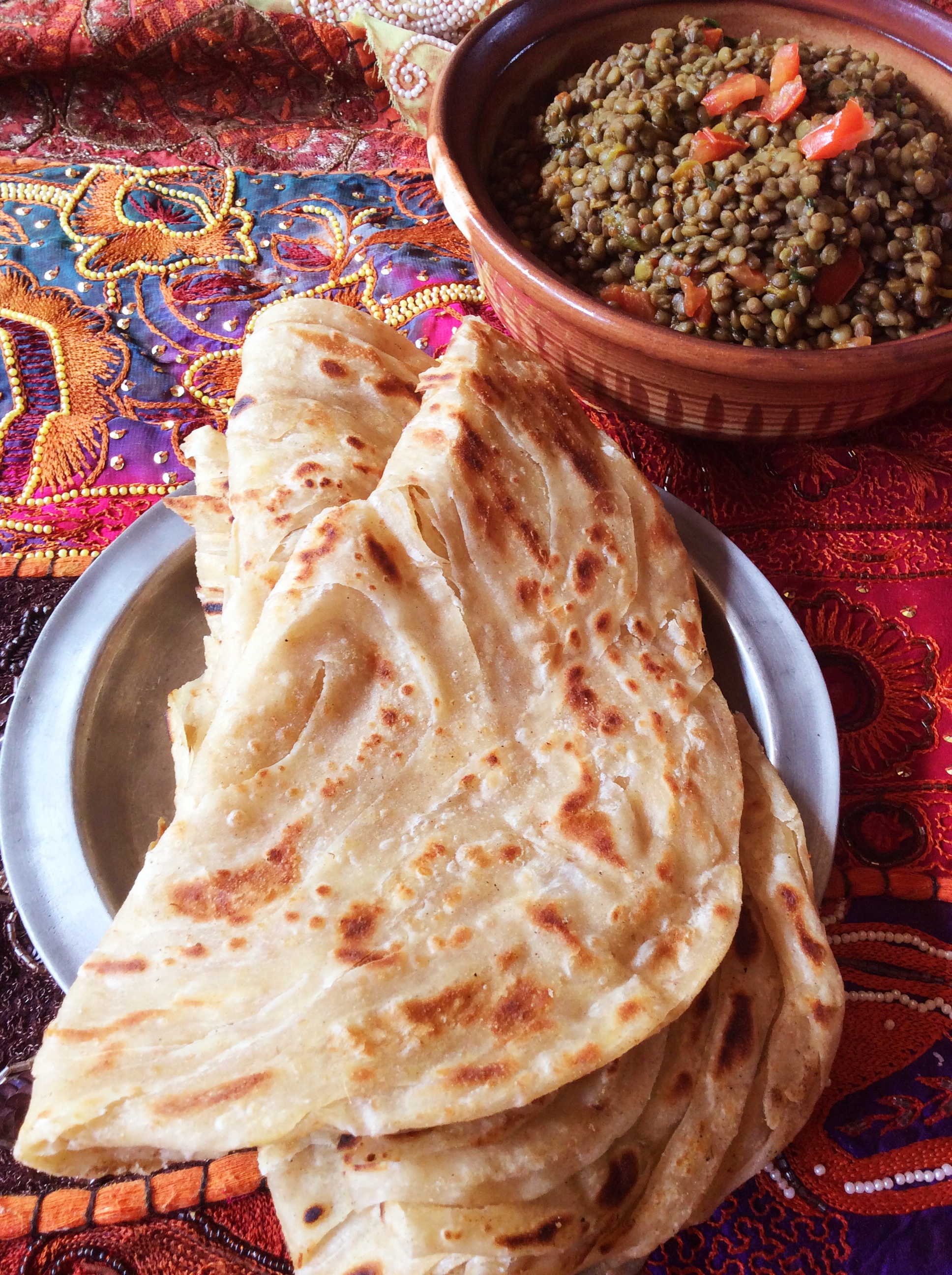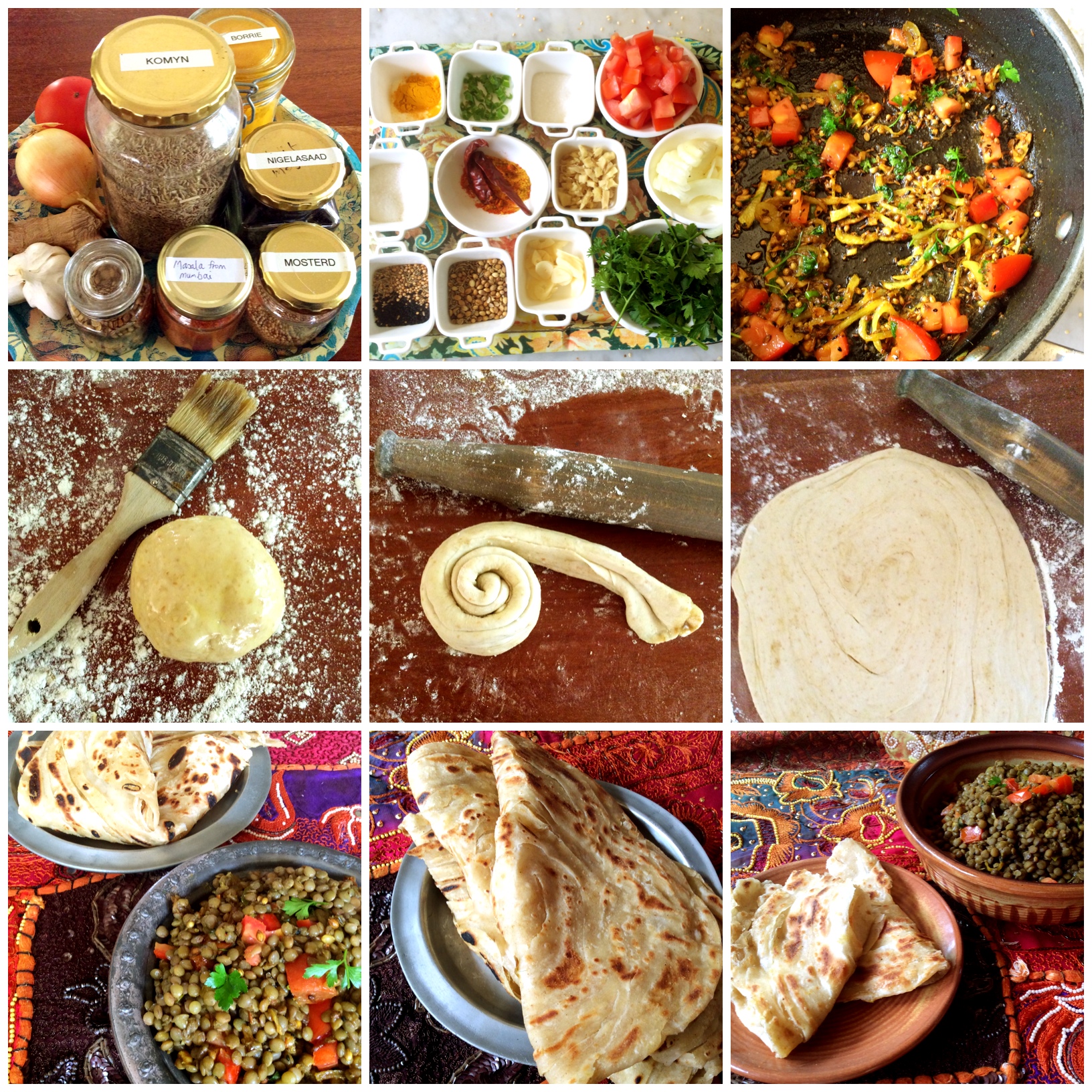 Goudgespikkelde rotis met dhal, ‘n lensiegereg met geurige speserye, vars gemmer en koljander.
