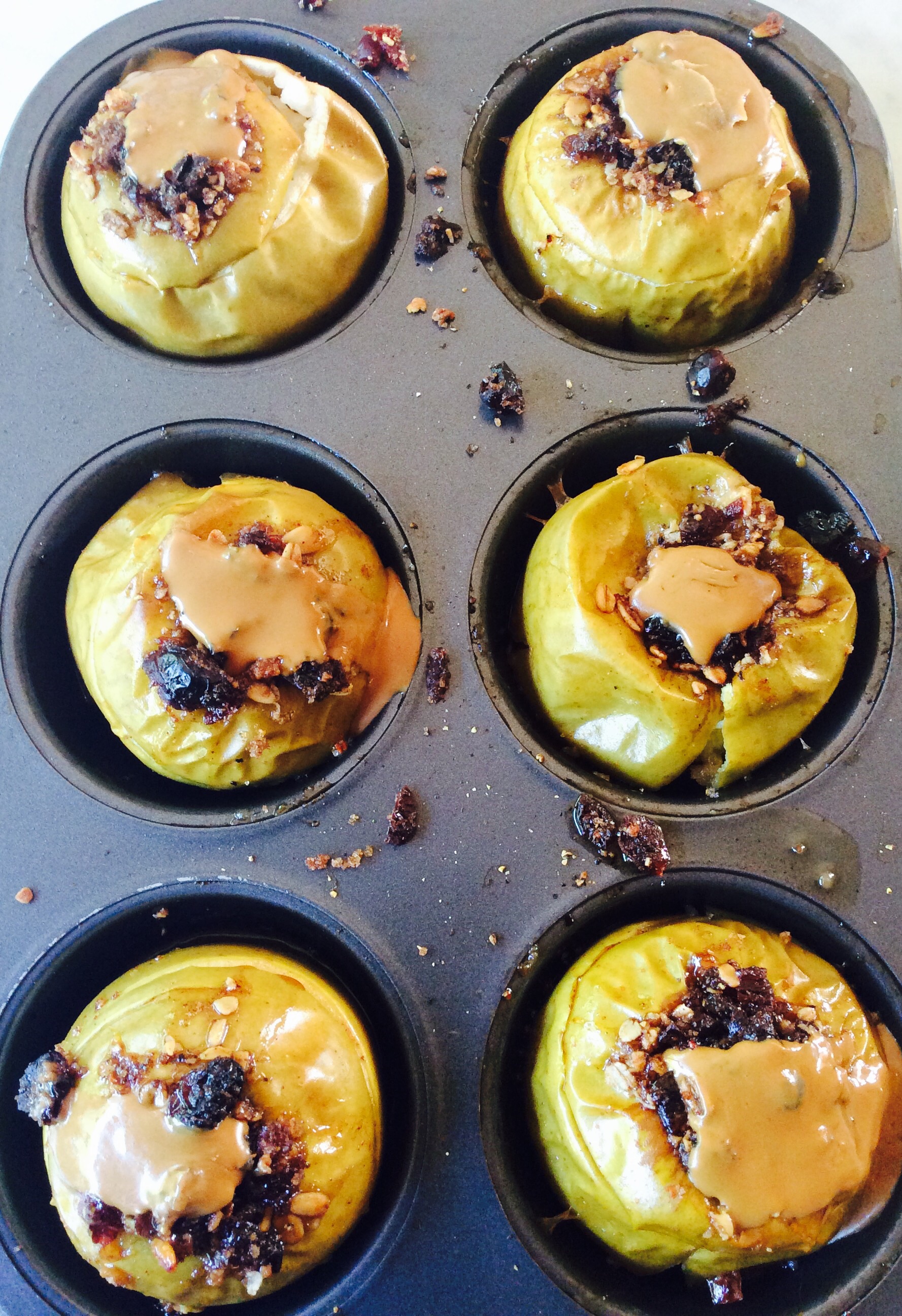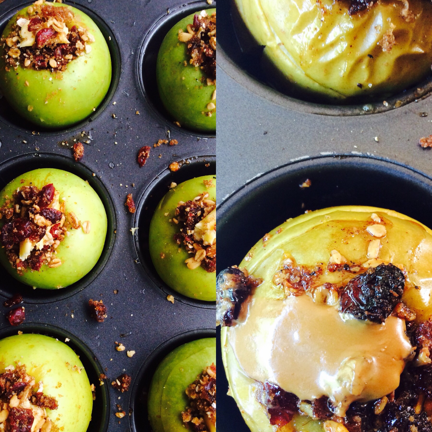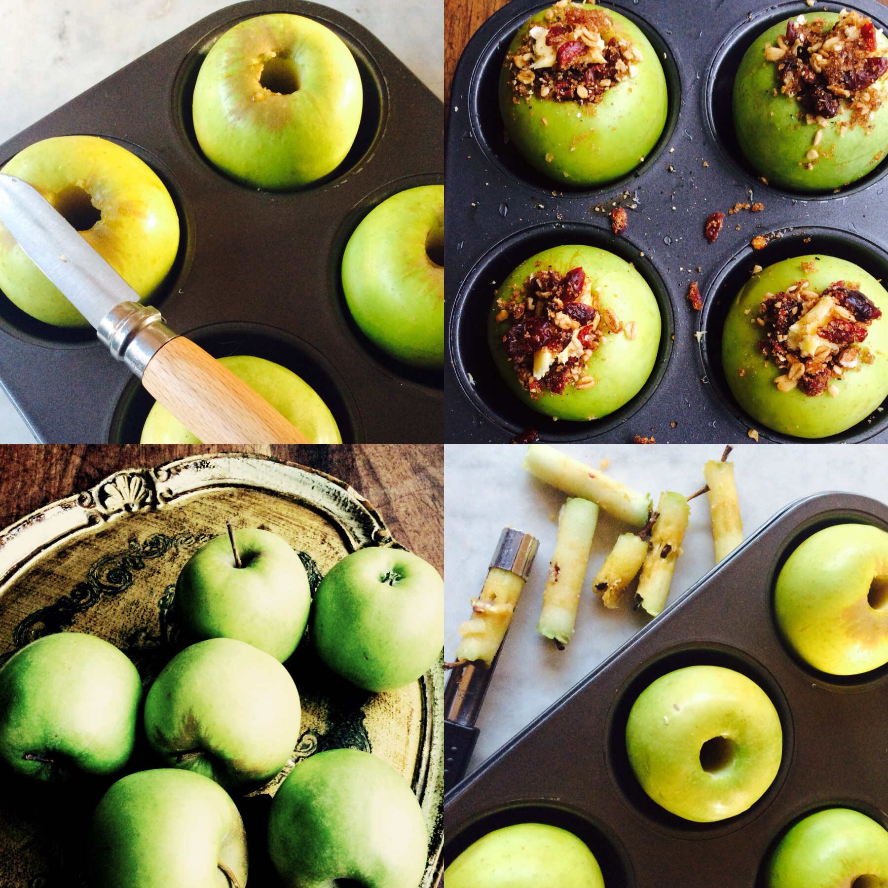 Meng die fyngekapte dadels en bosbessies, bruinsuiker, muesli of koekiekrummels, speserye en sout. Druk die vulsel styf in die appelholtes, plaas in die muffinpannetjie, sit klein klontjie botter op elke appel en strooi van die laaste vulselkrummels oor. Bak tot die appels sag is, maar nie heeltemal in mekaar gesak nie – kyk na 30 minute.