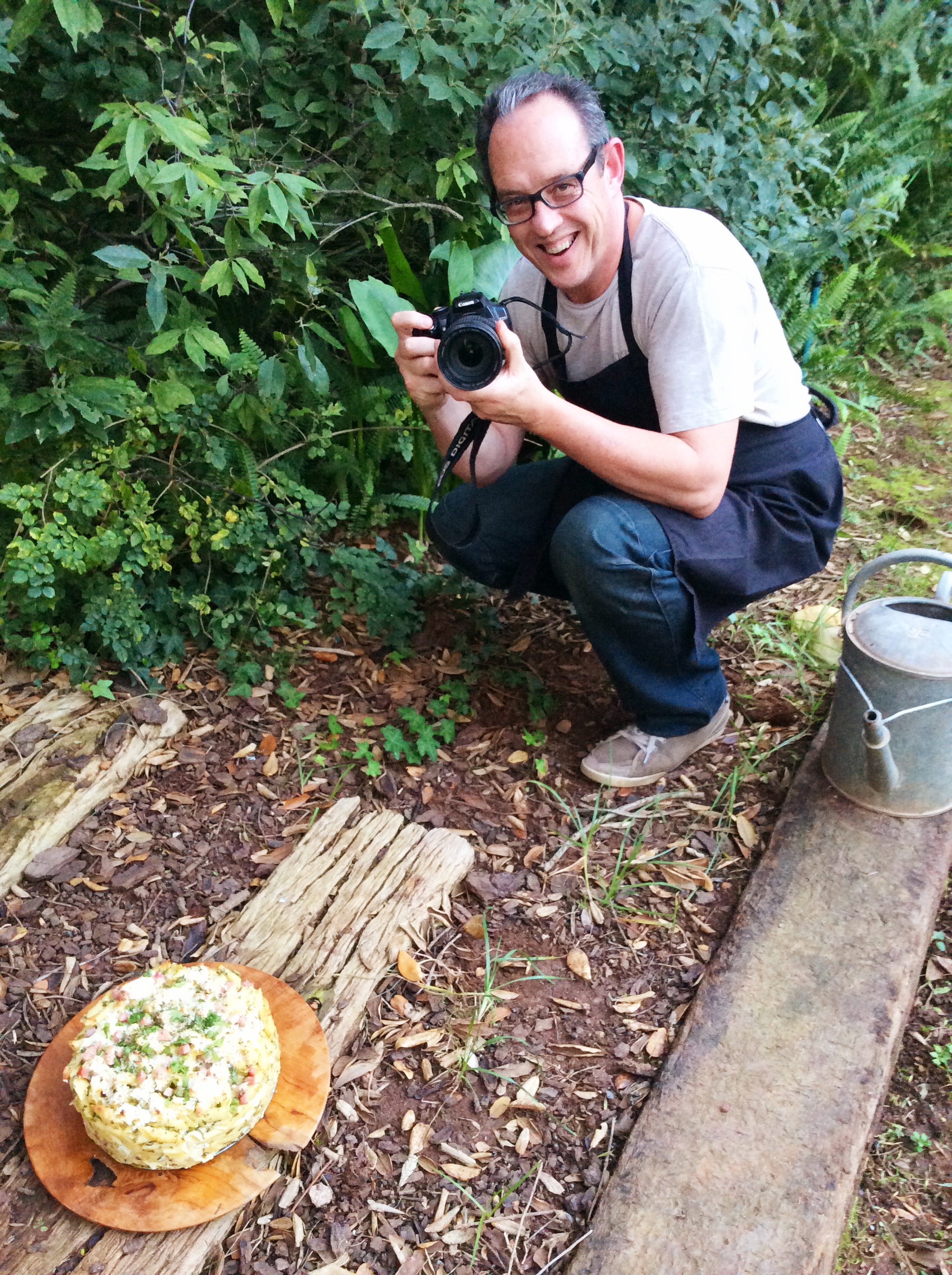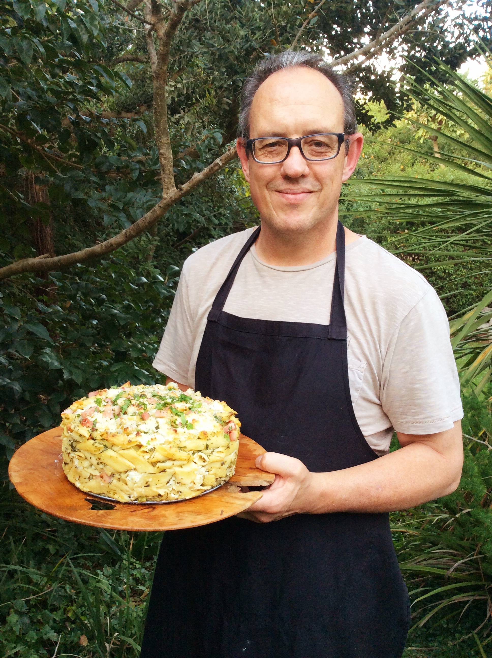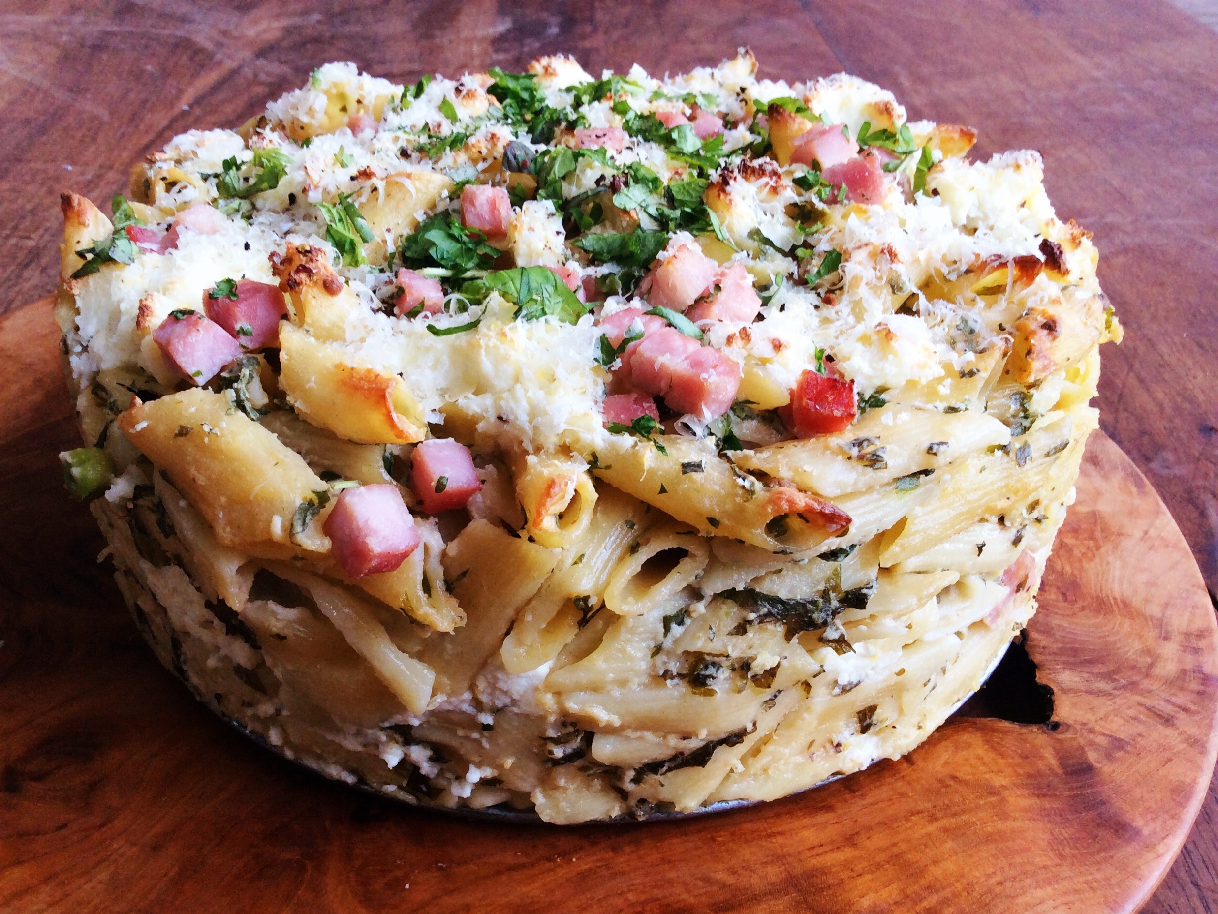 Vir hierdie besonderse kykie na ‘n ou trooskos-gunsteling trek ek drie kase nader … en ‘n koekpan vir ‘n macaroni- en-kaas-koek. ‘n Nuwe ervaring vir my. My man was so nuuskierig dat hy self ook ingespring het om dit te maak. Die ricotta speel ‘n hoofrol in die mac-en-kaaskoek, wat ‘n goeie aansporing was om my eie ricotta te maak. Saam met die parmesaan en fontinakaas vul tuinertjies, piepklein blokkies ham, hope kruisement, pietersielie en rocket die geure verder aan.