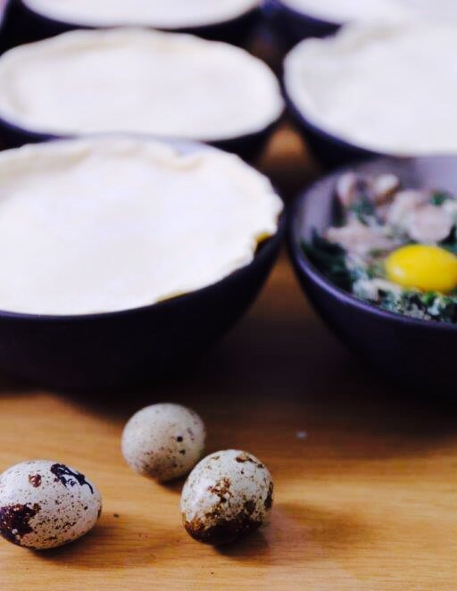 Gewoonlik blindbak ek deeg in die oond (maar dis as die pasteitjie die hoofgereg is) en skep dan die spinasiemengsel in die pasteidop. Maak ‘n holtetjie met ‘n lepel en breek ‘n kleinerige eier in dit. Plaas kombersie van deeg bo-op en smeer eier oor met kwassie. Bak 10 minute teen 200 C en 20 minute teen 180 C tot die deeg goudbruin is. Die eier met nog effe loperig wees.”