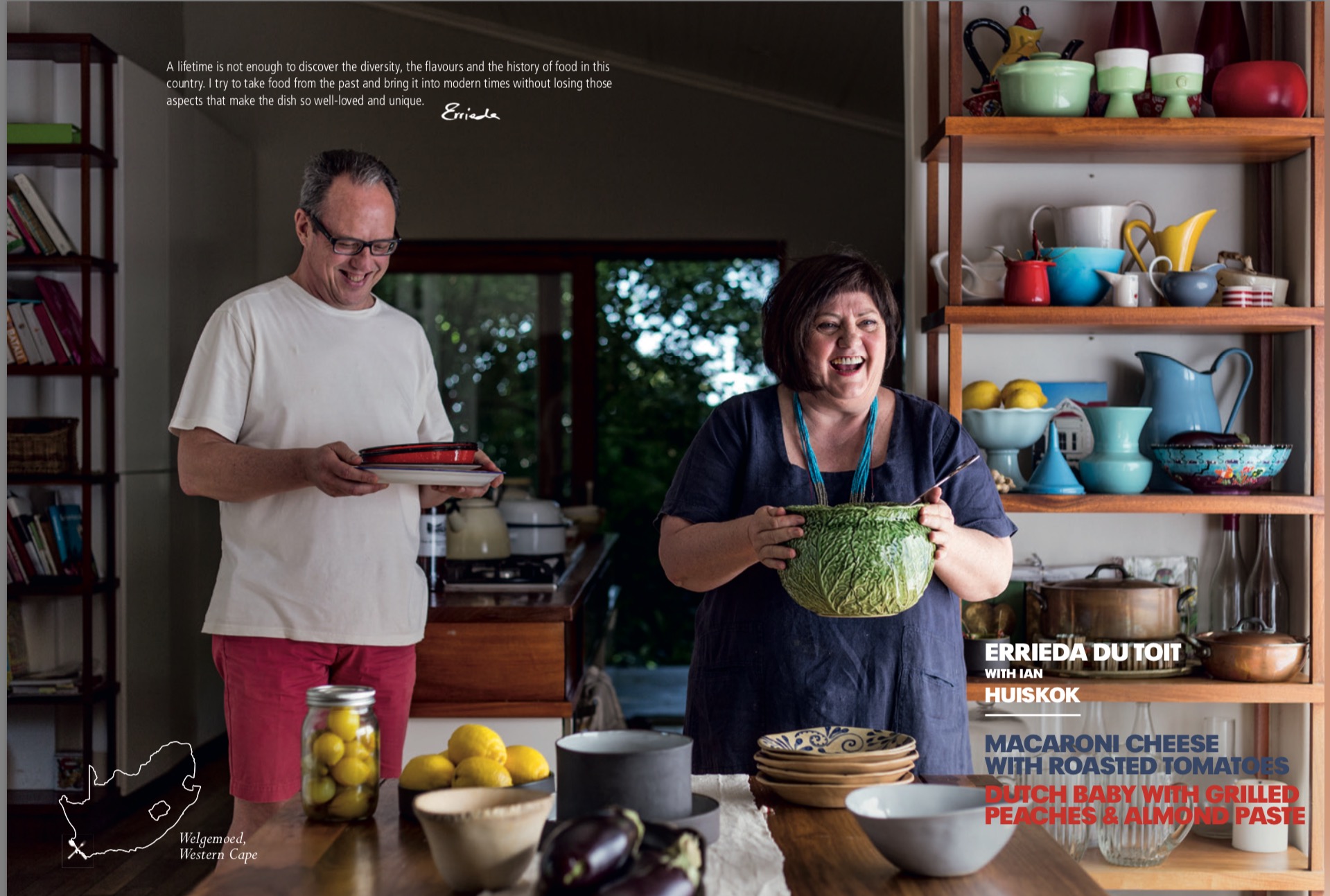 Jy sal my en my man Ian ook in die boek sien met twee van ons huisgunstelinge – my ma se macaroni en kaas met ‘n byderwetse bokors van broodblokkies en sonryp-rosatamaties; asook ‘n pof-oondpannekoek met geroosterde perskes en amandelsmeer.