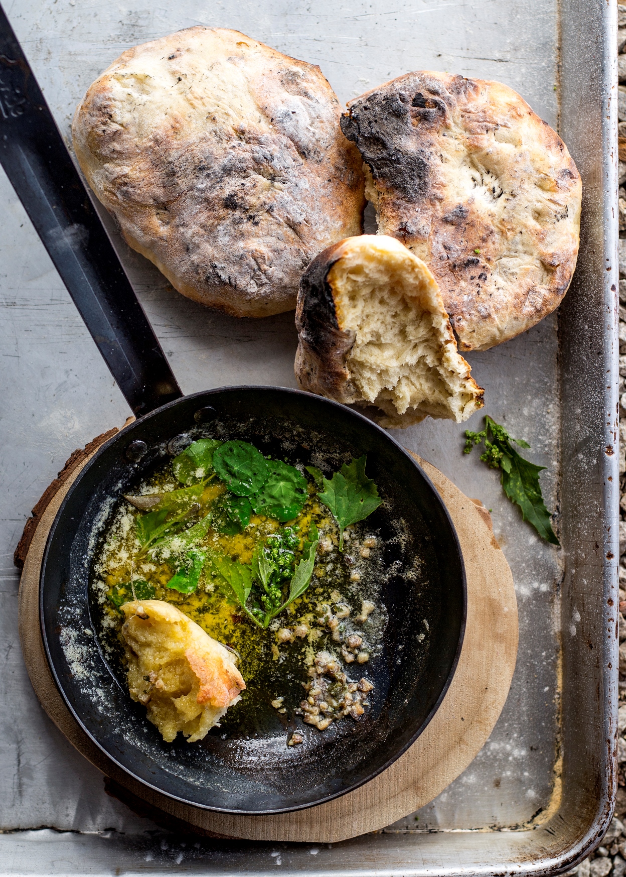 Sif die meel in ‘n emaljeskottel, voeg die sout en kitsgis by en roer deur. Maak ‘n holte in die middel en voeg louwater , meng vinnig met die hand tot die goed bymekaar kom in ‘n rowwe bal. Keer die deeg uit op ‘n meelbestrooide oppervlakte. Vou 4 keer dubbel en druk liggies af. Laat uitrys tot die volume verdubbel, sowat 40 minute. Vou die deeg dubbel en druk liggies af. Vorm 6 plat ovaal stukkies deeg en plaat direk op die uitgebrande kole en as, bedek met nog kole. Bak sowat 20 minute of tot hulle hol klink wanneer jy met die kneukels daarop klop. Borsel die as en kole af.