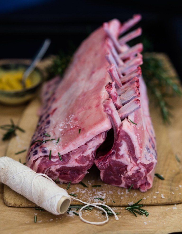 - Voorverhit die oond tot 190°C, oondrak in die middel. Buig elke lamsrak in ‘n halfsirkel met die vleiskant na binne, vetkant na buite. Knoop die ente aanmekaar vas met kombuistou. Verstewig dit reg rondom met nog tou.