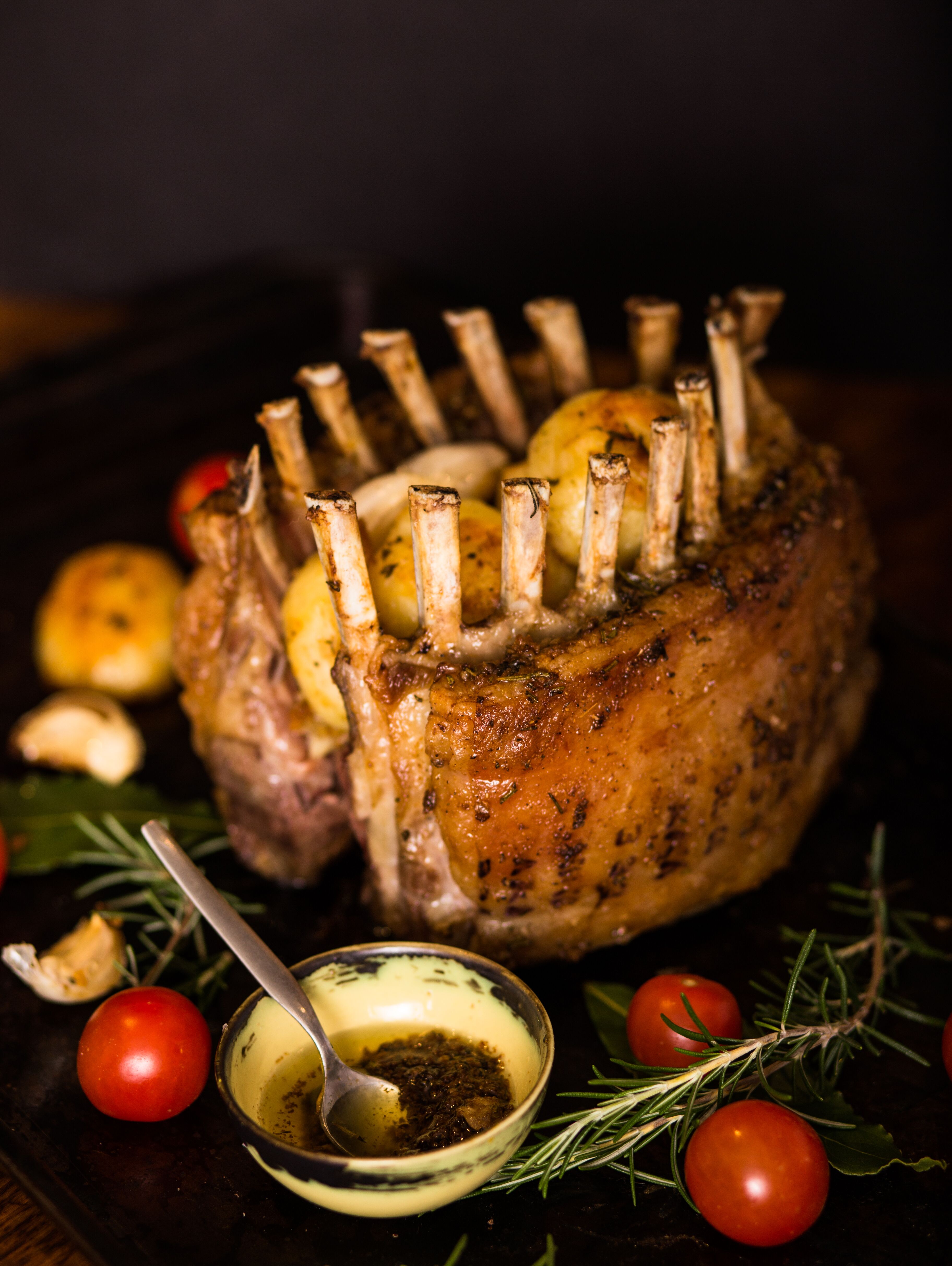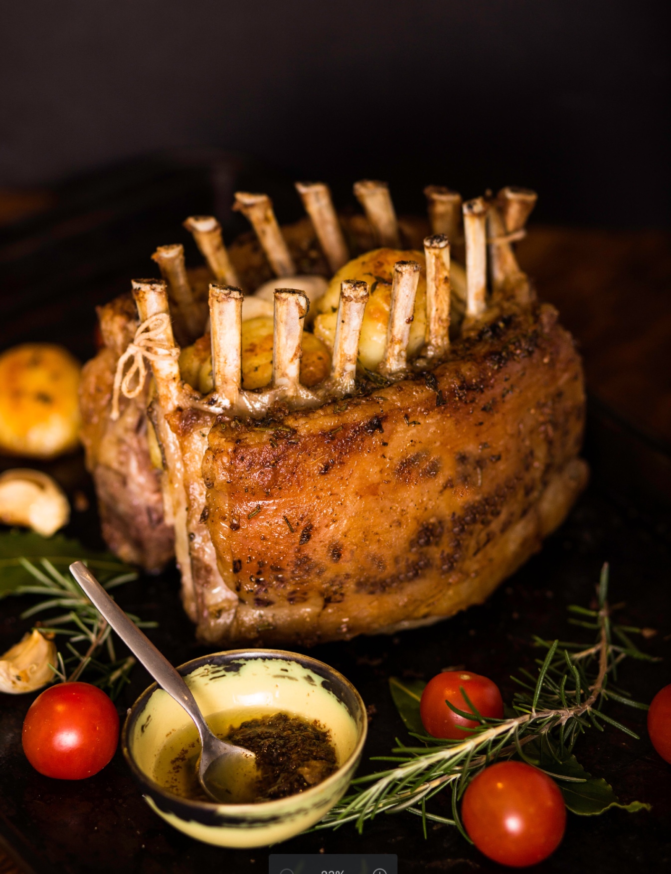 Die ribbene word skoongemaak (‘frenched’) sodat dit makliker inhak, en vasgebind met kombuistou. Om dit gaar te maak rooster dit by 180°C vir 25 minute, plus 25 minute ekstra per 450 g.