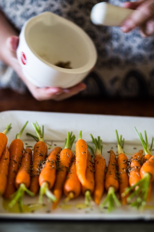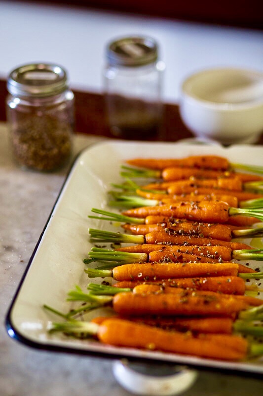 Voorverhit oond na 200ᴼC. Skrop die jong worteltjies. As jy nie skraal wortels in die hande kan kry nie, sny groot wortels in die lengte af in kwarte. Pak dit in ‘n enkellaag op ‘n bakplaat, voeg die olyfolie, speserye en sout en per by, meng dit deur om goed te bedek en rooster sowat 30 minute tot net-sag. Dit sal effe krimp.