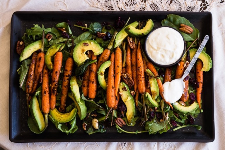 As daar ‘n slaairesep is wat van kombuis tot kombuis geswerf het tussen Britse, Ierse en Frans-Amerikaanse kokke is dit hierdie skepping met sy kontras tussen die worteltjies warm uit die oond en die avokado koud uit die yskas! Maar moenie dat die slaai se pedigree jou skrikkerig maak nie (sjef April Bloomfield van Spotted Pig-faam en meestersjef Jan-Georges Vorgerichten, Food 52 en Sur lê Table het almal ‘n hand daarin), want dis glad nie cheffy nie.