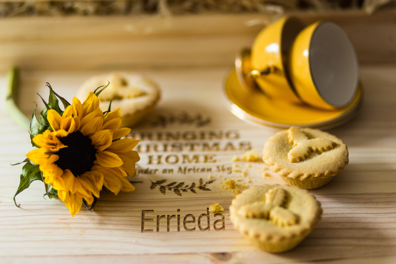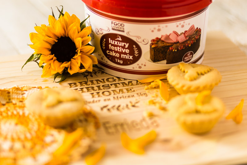 Food Lovers Market het my geinspireer met die tema ‘om Kersfees huis toe te bring onder die Afrika Hemel’. Ek vertolk dit met die geel van sonneblomme, ‘n oranje-en-geel delikate doilie van my Ma Inez en die sitrusgeure van die lemoenboorde uit haar Clanwilliam-grootwordjare; sultana se goud en bruinsuiker se amber. Alles kleure van gasvryheid en warm mense wat sal hou van ‘n  ‘Kom-drink-by-my-Tee’ vrugtekoekteebroodjie.