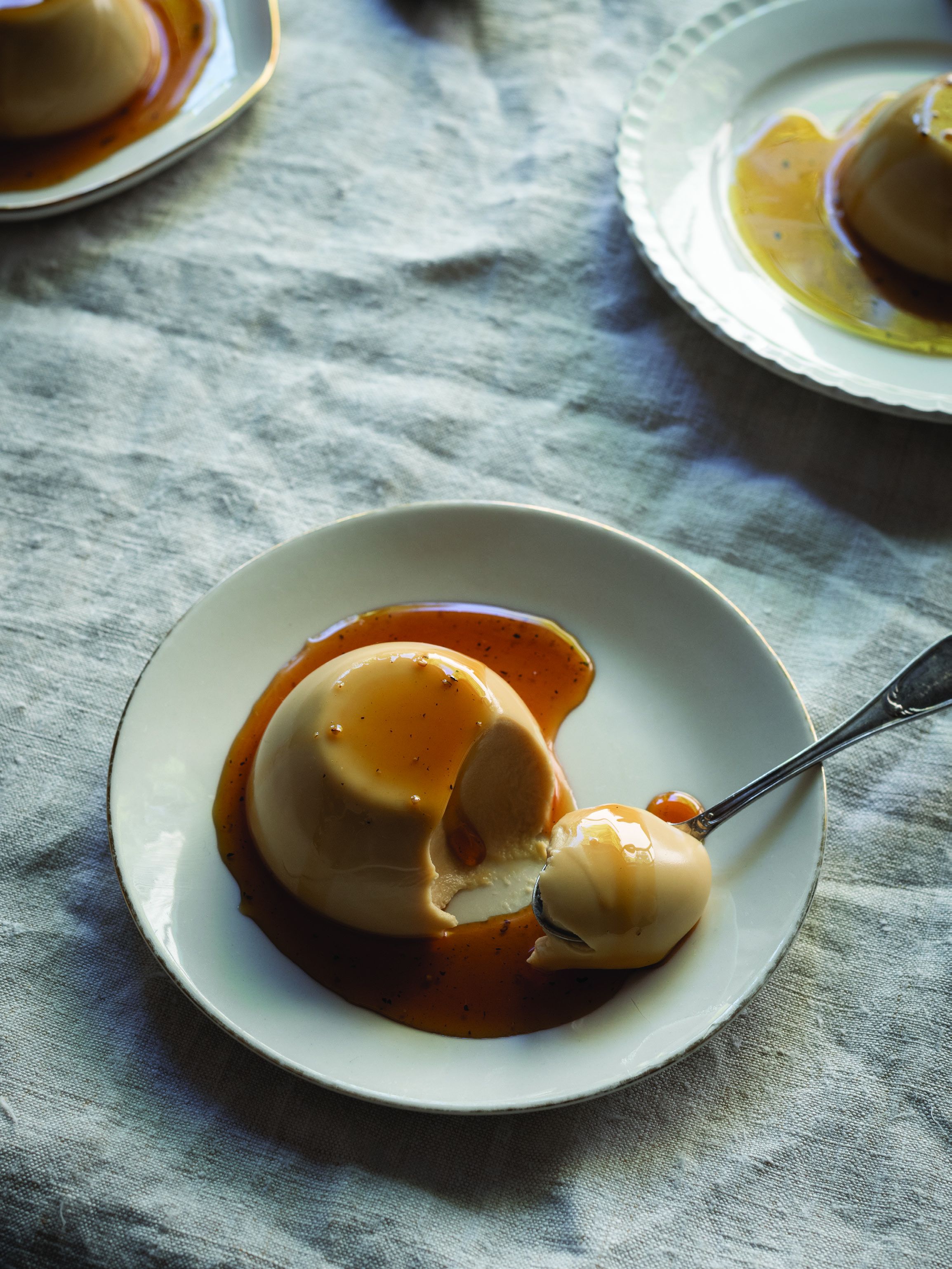 Geroosterde witsjokolade panna cotta met peper–sjerriekaramel