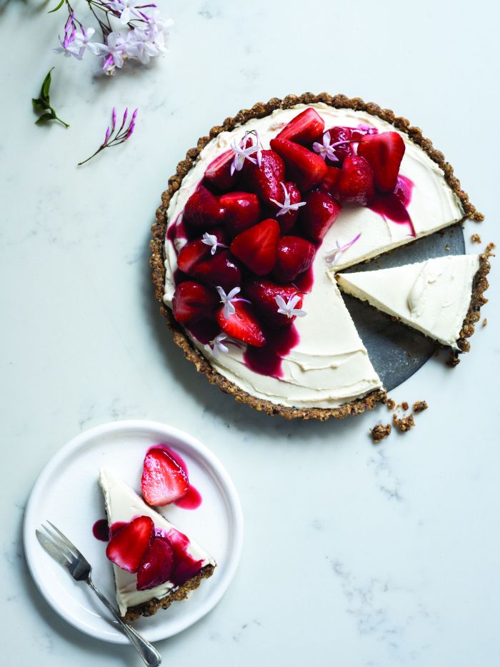 Net voor opdiening, rangskik die bessies op die kaaskoek en drup die coulis oor.