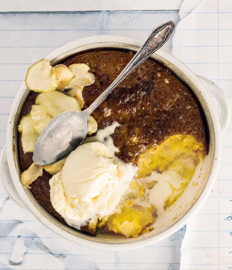 • Maak intussen die sous: Kook al die bestanddele vir die sous 7—10 minute saam in ’n medium kastrol. Prik die poeding en giet die warm sous oor die warm poeding. Sit voor met vla, room of crème fraiche.