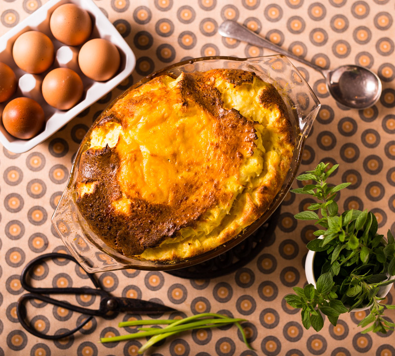 Die souffle met sy imposante pofbolaag en eteriese tekstuur is een van die klassieke geregte met ‘n reputasie dat dit moeilik is, ‘n sensitiewe gereg wat selfs ervare kokke intimideer. Sjef Pepin se resep kom egter met gerusstellings. Daar’s geen geskei van die wit en eiergeel nie, geen punterige geklits van die eierwit met al die reëls wat daarmee saamgaan nie. Daar’s geen aparte invou van die delikate, styfgeklitste eierwit by die bechamelsous nie. Dit verg nie eers ‘n spesiale ramekin-bak met kietsregop kante nie en ‘n ovaalbak skep ‘n groter area van die begeerlike bruingebakte pofkors.