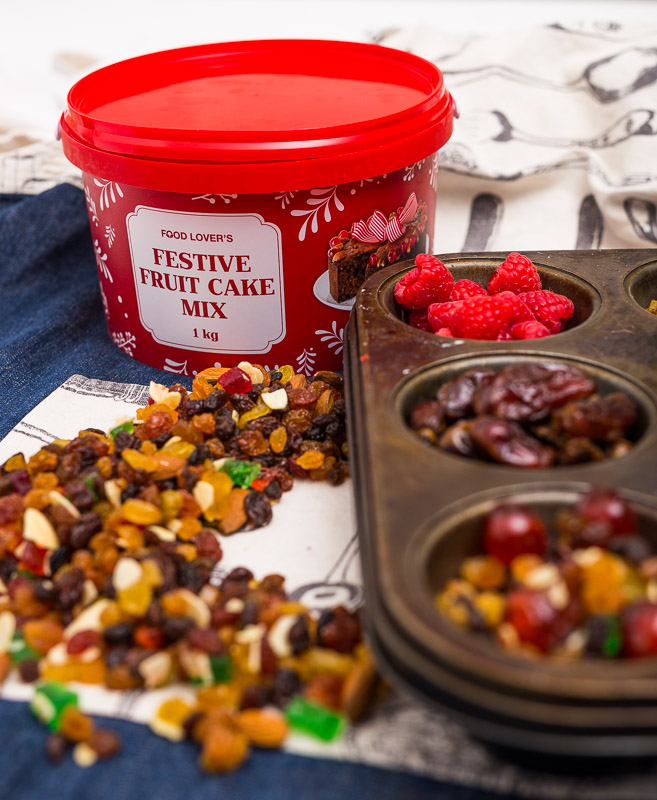 Tannie Ria het korente, rosyne en dadels gebruik vir haar franzipan-styl vrugtekoek, terwyl ek Food Lover’s Market se legendariese Festive Fruit Cake Mix in die geliefde rooi emmertjie die fokus maak. Dit bevat reeds rosyne, sultanas en versuikerde skil en is propvol neute en vrugtestukke.