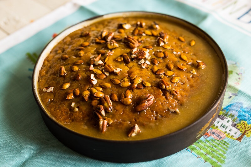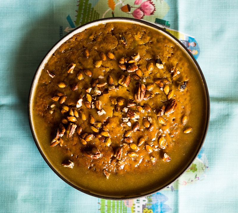 Pampoen- en okkerneutpoeding met toffiesous (en lugbraai-pampoenpitte as jy wil)