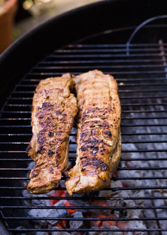 Ons braai die varkfilet eers so 4 minute aan ‘n kant oor warm kole om ‘n lekker geurkors te vorm, en skuif dit dan na koeler kole – dan kry dit die koepel op en braai nog ‘n paar minute tot die interne temperatuur 62° C is. Hier moet jy wakker wees, want die dunner vleis raak gou gaar. Dis ‘n mite dat vark goedgaar moet wees. Dit moet ligpienk binne van die kole afkom.