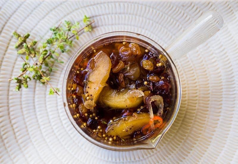 Gebruik ‘n medium kastrol en droogrooster die koljander- en mosterdsaadjies vir 1 minuutoor medium-hoë hitte. Voeg die sjalot, appel, perske, steranys, tiemie, suiker en asyn by enbring tot kookpunt. Verlaag die hitte tot laag en prut totdat die vrugte sag word en die vloeistof verminder en verdik, ongeveer 20 minute. Verwyder van die hitte en geur met souten peper. Roer die gemmer by en hou eenkant om af te koel. Gebruik dadelik of bêre in die yskas in ‘n lugdigte houer vir tot 2 weke.