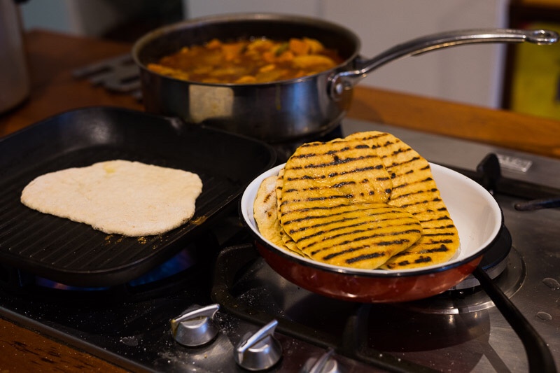 Strooi meel op toonbank, rol ‘n bolletjie uit met bestrooide rolstok lekker dun uit. Braai die naandeeg aan beide kante in ‘n warm riffelpan.