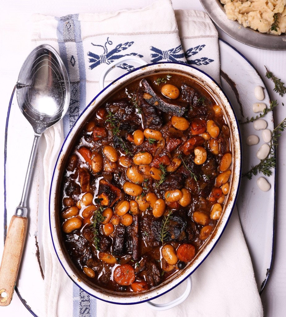 Voeg halfgaar bone, tiemie, asyn en nog biefafstrek by indien nodig (die bone soek vog om sag te word). Bedek en bak nog 90 minute tot die bone sag is en vleis van die bene afval. Druk van die bone fyn om die sous te verdik. Geur.