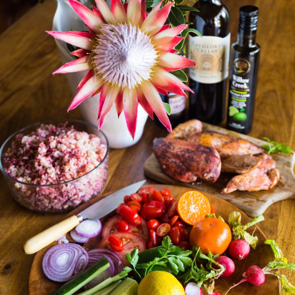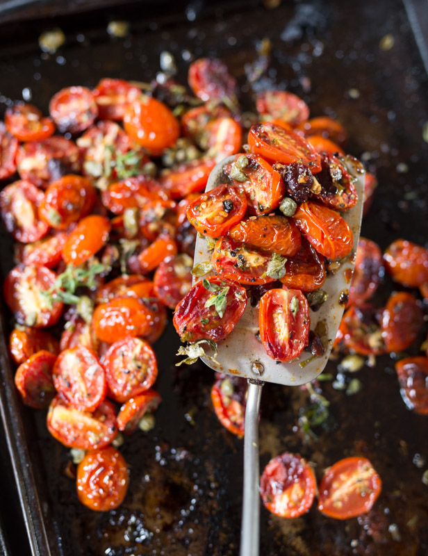 Geroosterde kersietamatiesous vir pasta-aand + soetrissie agrodolce op bruschetta & geklopte roomkaas-feta + perskes- en hoenderlewer agrodolce