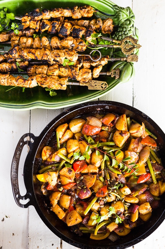 Stokkieshoender in geurige jogurt-marinade (Shish Tawook) + Indiese ratatouille