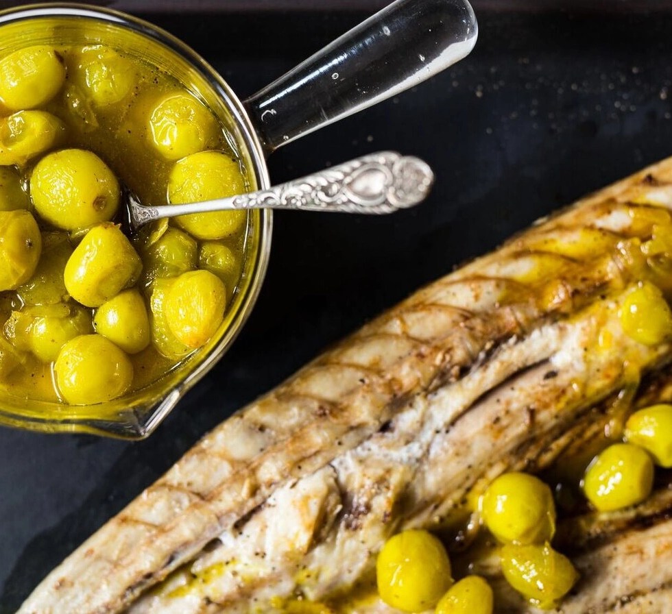 Varkfilet oor die kole en stroperige suurdruiwe